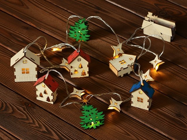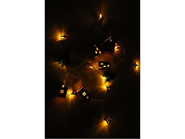 Комплектность: домик- 5 шт., елочка- 2 шт., звездочка- 8шт., лампочка (горит желтым цветом)- 15шт.