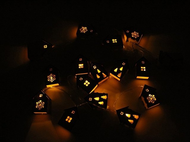 Комплектность: домик- 15 шт., лампочка (горит желтым цветом)- 15шт., коробка 21,7 х 16,7 х 9,3 см