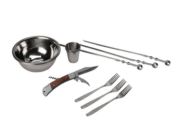 Комплектность: шампур- 3шт, миска 500мл- 3шт, вилка- 3шт, стопка 70мл- 3шт, нож многофункциональный