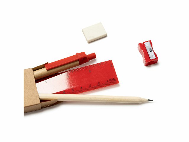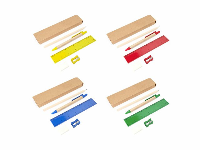 Канцелярский набор. Включает ручку с картонным корпусом и синими чернилами, деревянный карандаш, точилку для карандашей, ластик и линейку длиной 15 см.