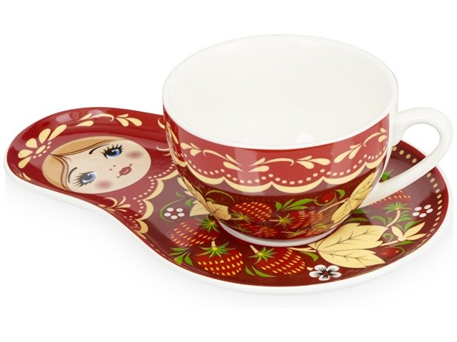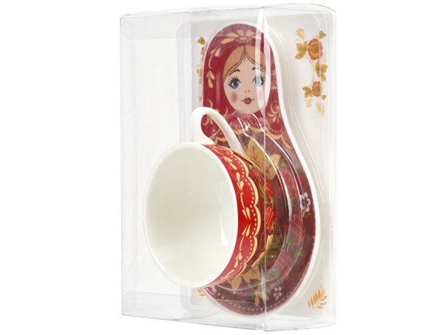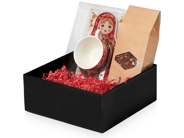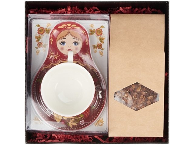 В наборе вы найдете необычную чайно-кофейную пару с подставкой в виде русской «Матрешки», которая является одним из главных символов России и чай "Глинтвейн" фруктовый, 90 г. Набор поставляется в дизайнерской коробке из ламинированного картона.
