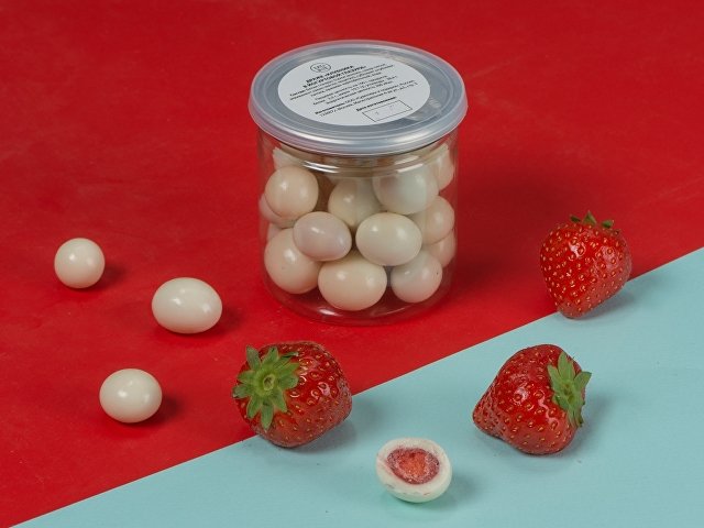 Клубника в йогуртовой глазури. Состав: йогуртовая глазурь (сахар, молоко сухое обезжиренное, какао-масло, сыворотка молочная сухая, йогуртовый порошок натуральный (молоко обезжиренное питьевое пастеризованное, мальтодекстрин, молочная кислота), эмульгатор лецитин, сублимат клубники.