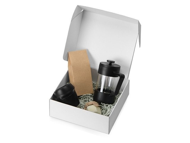 Комплектность: френч-пресс 600 мл, стеклянный стакан с силиконовой крышкой и манжетой 350 мл, кофе зерновой 100 г, бумажный наполнитель 50 г, подарочная упаковка 26,