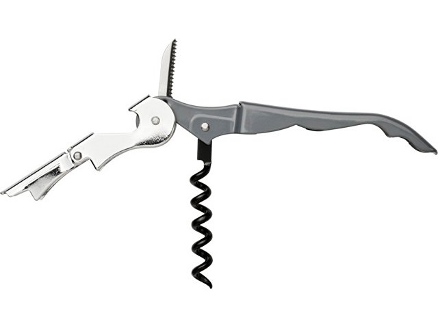 Штопор с буравчиком, открывалкой для бутылок и ножом для срезания фольги. Нержавеющая сталь.