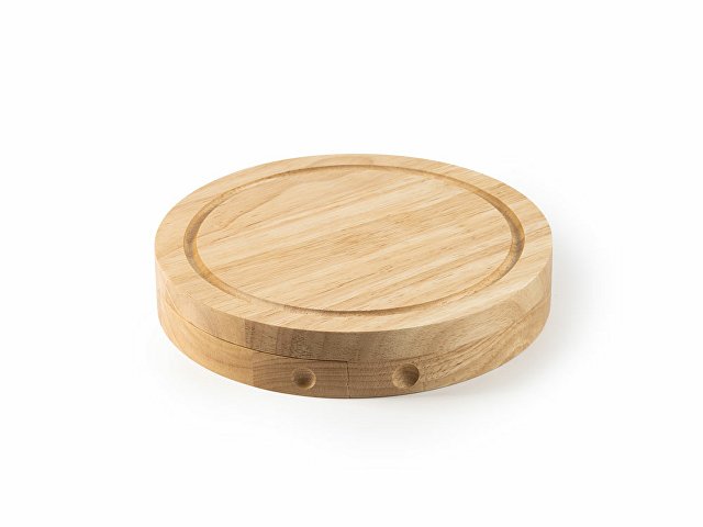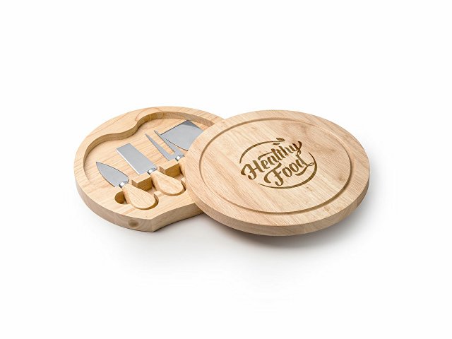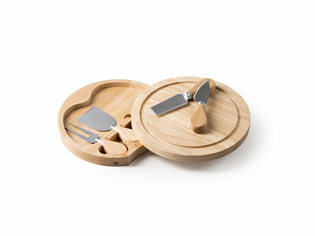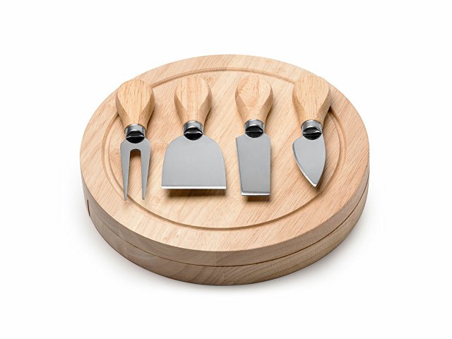 Набор для сыра с 4 столовыми приборами из нержавеющей стали и деревянными ручками. Представлен в практичном деревянном футляре с разделочной доской в верхней части.