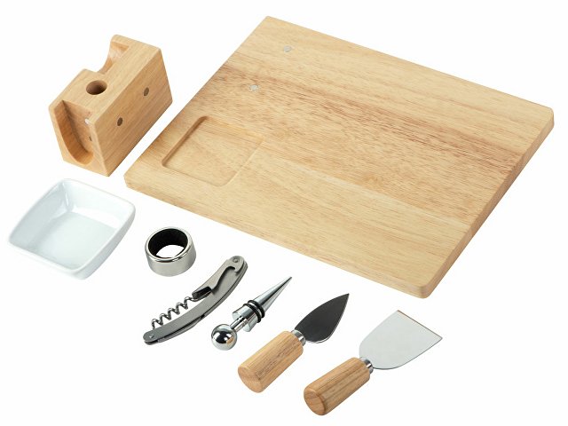 Комплектность: разделочная доска / доска для подачи закусок, соусница / емкость для оливок , штопор, пробка для вина, кольцо для винной буиылки, два сырных ножа