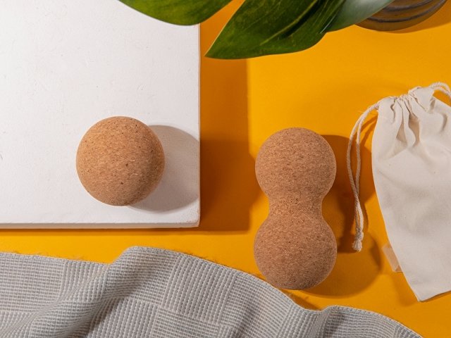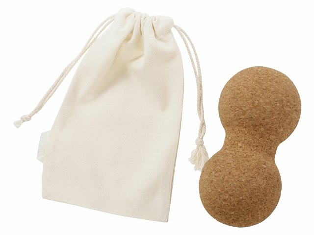 Двойной массажный мяч из пробки спортивного бренда Vibe в хлопковом мешочке на завязках, напоминающий по форме арахис. Подходит для массажа групп мышц вдоль позвоночника и шеи.